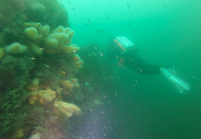 Dive 4 a drift dive in about 20m of water initially on a block ship then along a kelp and boulder sea bed.